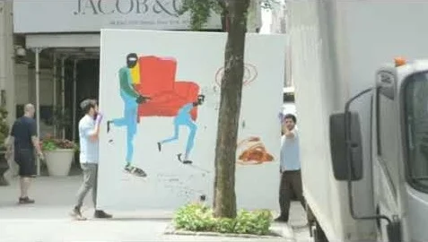 blue collar takes its cue from basquiat’s painting, light blue movers, which depicts two black men moving a piece of furniture. in mercury’s performance two latino men, working for a reputable art handling company, transport light blue movers from phillips de pury’s auction house to a private gallery. however, the whole production is simulation; the painting, uniforms, paperwork, company truck, and institutional interactions were created without permission. the original basquiat painting sold in 2008 for millions to a private owner. the video is edited to the song, 8 hour religion, by basquiat’s old band, gray